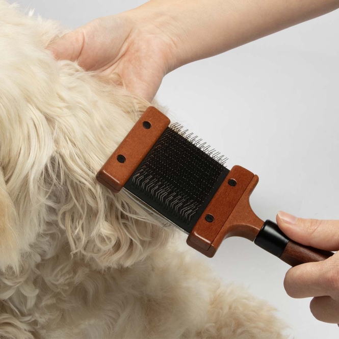 Die Duo-Slicker-Bürste von Noir Japandi verfügt über einen flexiblen Bürstenkopf, der sich mühelos an die Körperform Ihres Haustiers anpasst. Die Edelstahlstifte ? kurz auf der einen und länger auf der anderen Seite ? entfernen sanft lose Haare, Schmutz, Verfilzungen und abgestorbenes Unterfell, ohne die Haut zu reizen. Geeignet für alle Felltypen und ideal für langhaarige Tiere. Ausgestattet mit einem ergonomischen Griff aus FSC-zertifiziertem Buchenholz mit dunkel gebeizter Oberfläche.