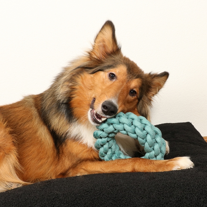 Das Hundespielzeug Ben ist ein robuster Knotenring, der aus 100 % Baumwolle angefertigt wurde und daher sehr dauerhaft ist. Schnüre aus natürlicher Baumwolle sind bei Hunden als Kaumaterial beliebt und bieten ihnen stundenlangen Spielspaß. Das Kauen auf diesem Material trägt außerdem zu einem gesunden Gebiss und Zahnfleisch bei.