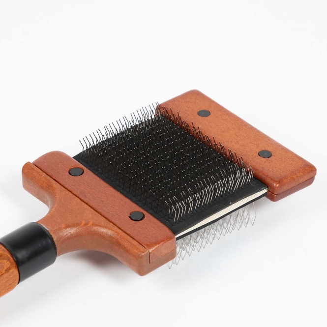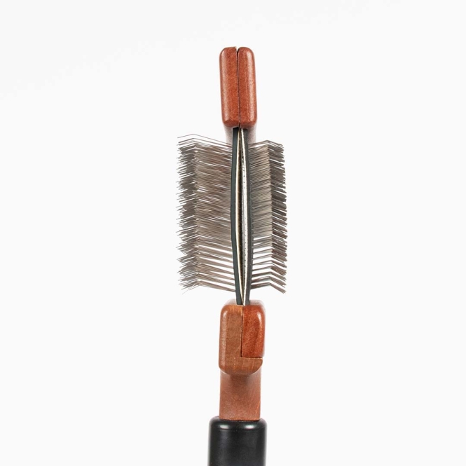 Die Duo-Slicker-Bürste von Noir Japandi verfügt über einen flexiblen Bürstenkopf, der sich mühelos an die Körperform Ihres Haustiers anpasst. Die Edelstahlstifte ? kurz auf der einen und länger auf der anderen Seite ? entfernen sanft lose Haare, Schmutz, Verfilzungen und abgestorbenes Unterfell, ohne die Haut zu reizen. Geeignet für alle Felltypen und ideal für langhaarige Tiere. Ausgestattet mit einem ergonomischen Griff aus FSC-zertifiziertem Buchenholz mit dunkel gebeizter Oberfläche.